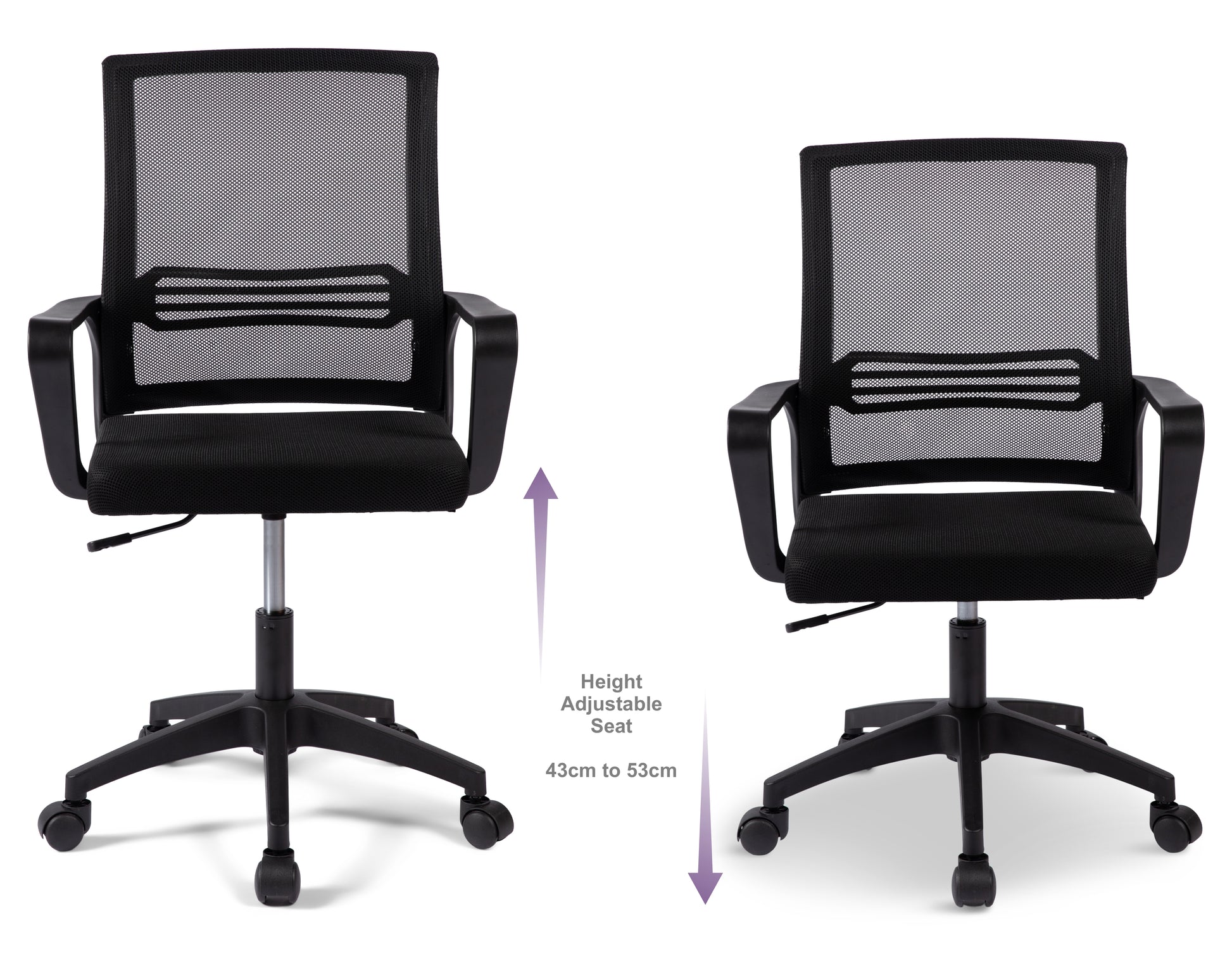The Ashford black mesh home office chair combines modern design, comfort, breathability, and everyday functionality at an incredibly keen price point. Its ventilated mesh back promotes airflow to keep you cool while you sit, and the fixed lumbar support and ergonomic backrest design help look after your back while you work or play. The height-adjustable, generously padded seat provides cushioned seating with high density foam, and the fixed armrests offer stable forearm support. The smooth 360-degree swivel base allows easy movement in any direction. Designed with a clean, contemporary profile, this chair is an excellent fit for home offices, study spaces, or any workspace that values comfort, simplicity and affordability.
