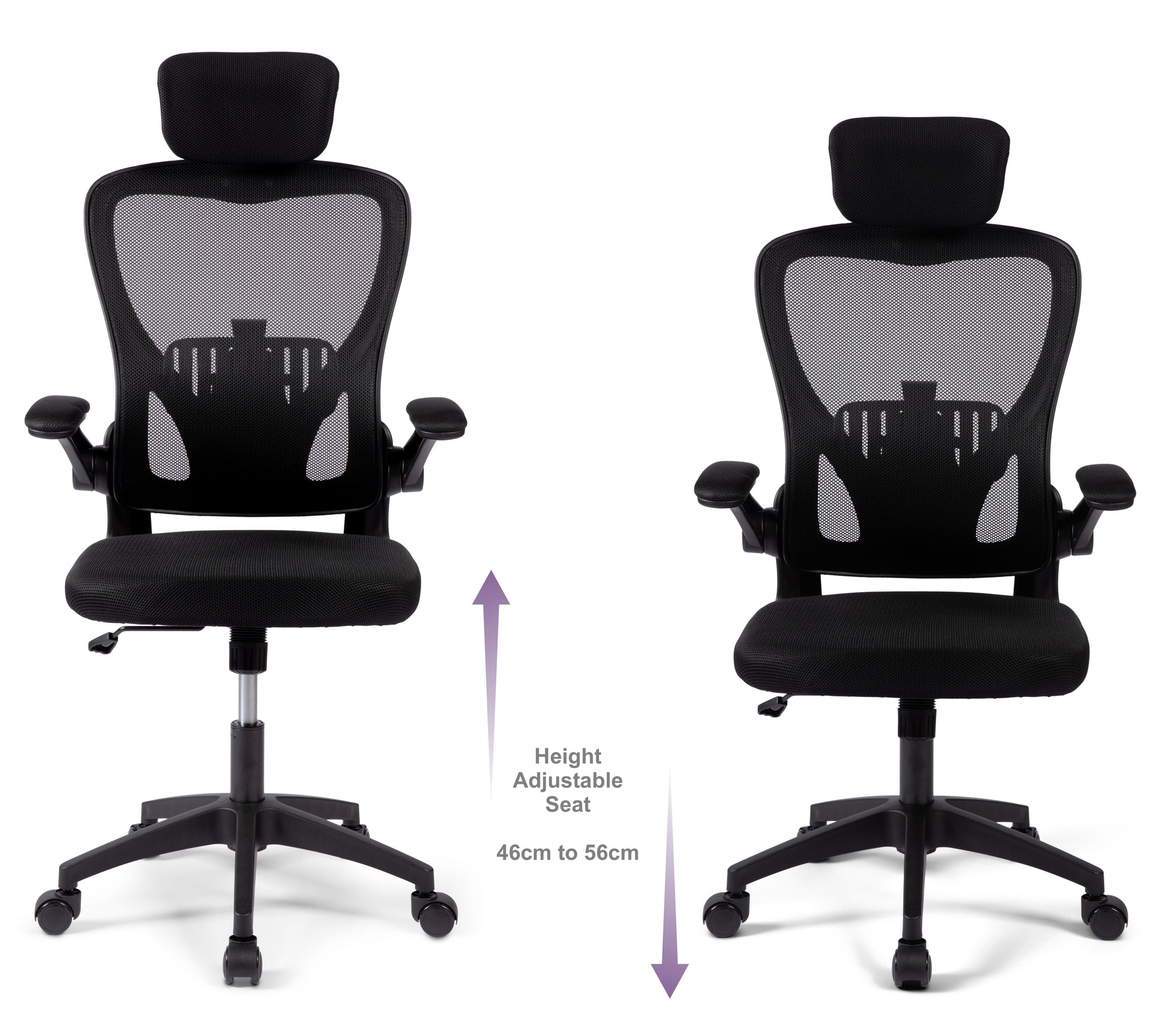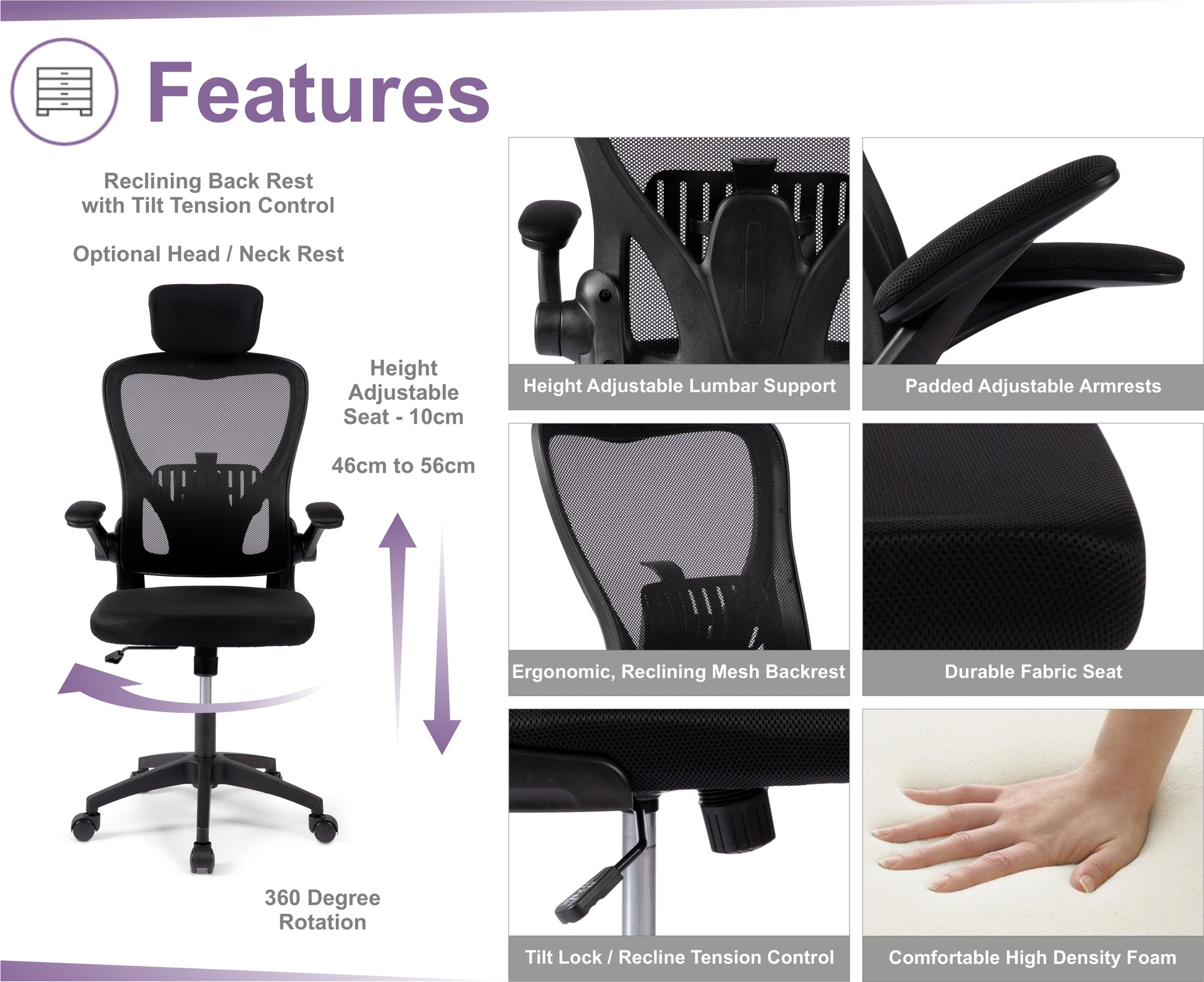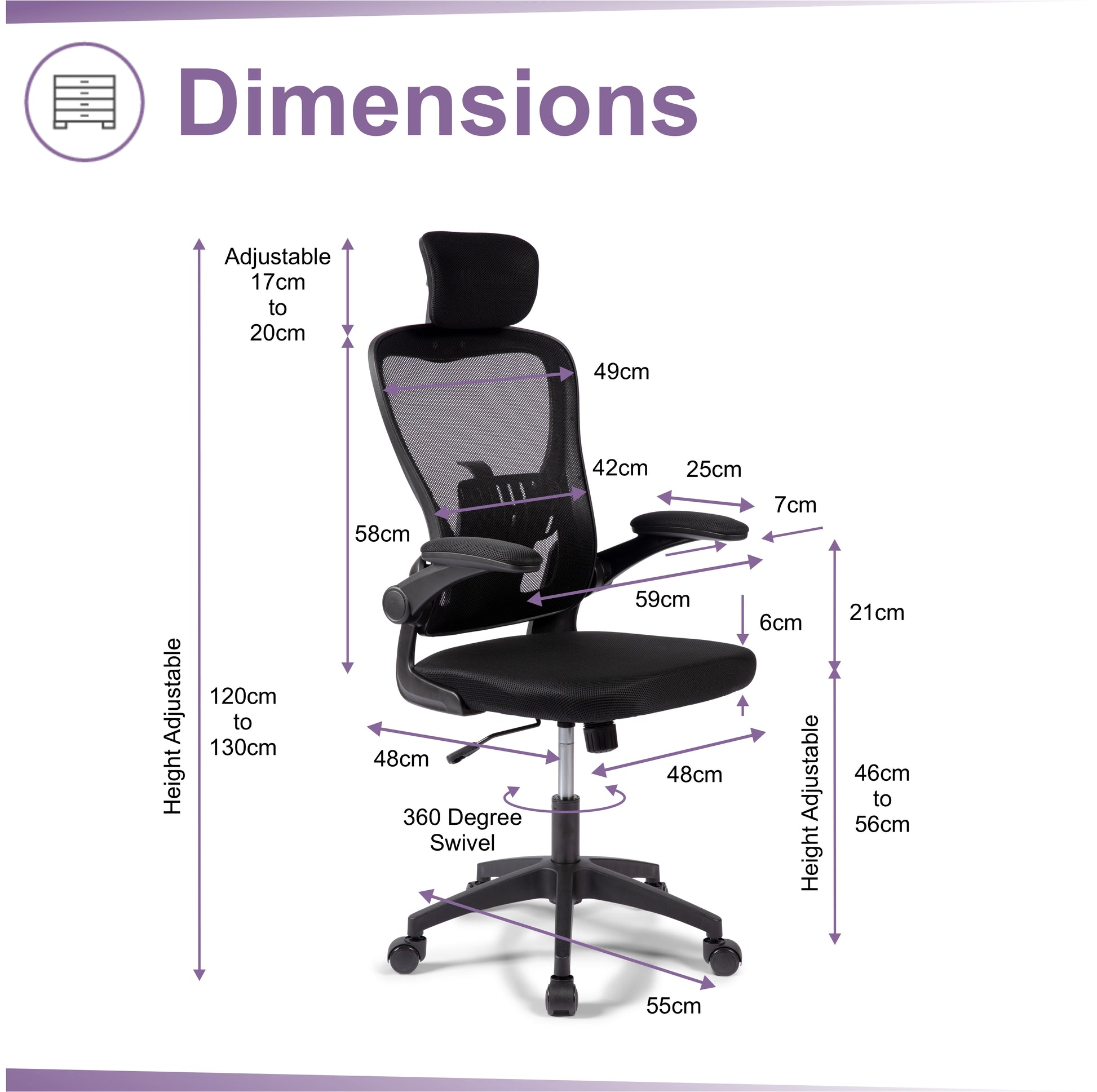 The Baslow black mesh home office chair combines modern design, comfort, breathability, and everyday functionality at an incredibly keen price point. Its ventilated mesh back promotes airflow to keep you cool while you sit, and the fixed lumbar support and ergonomic backrest design help look after your back while you work or play. The height-adjustable, generously padded seat provides cushioned seating with high density foam, and the foldable armrests offer stable forearm support. The smooth 360-degree swivel base allows easy movement in any direction. Designed with a clean, contemporary profile, this chair is an excellent fit for home offices, study spaces, or any workspace that values comfort, simplicity and affordability. Please note home assembly is required.